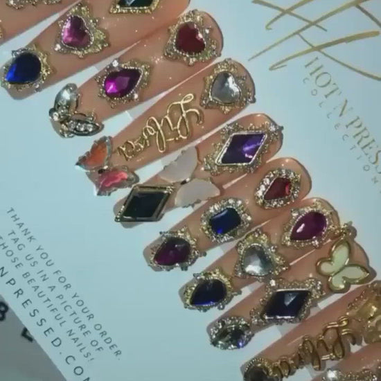 Celebrate yourself in style with our Bejeweled – Birthday Edition press-on nail set! Drenched in sparkle and dripping in glam, this luxe design features shimmering rhinestones, metallic accents, and eye-catching details that demand attention—just like you should on your special day.